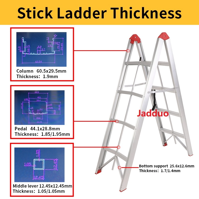 The Jadduo Black Oxidized Twin-sided Stick Ladder and Red Oxidation Stick Aluminum Box Ladder adopt advanced anodic oxidation technology. Besides providing classic silver, Jadduo also offers deep black oxidation and vibrant red oxidation finishes, delivering stronger surface hardness, better scratch resistance, and a premium appearance that stays beautiful even after years of heavy use.