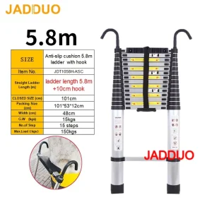 | Anti-slip cushion 5.8m ladder with hook | JDT1058H-ASC | ladder length5.8m+10 cm hook | 101cm | 101*53*12cm | 48cm | 15kgs | 15 steps | 150kgs | 560 | 1360 |