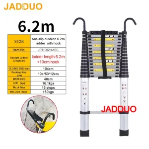 | Anti-slip cushion 6.2m ladder with hook | JDT1062H-ASC | ladder length6.2m+10 cm hook | 104cm | 104*53*12cm | 48cm | 16.1kgs | 16 steps | 150kgs | 538 | 1308 |