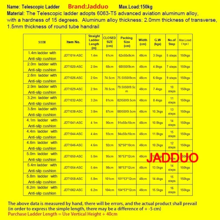 We understand that different tasks require different ladder lengths. That’s why our telescopic ladder comes in various sizes. No matter if you need a shorter ladder for simple household chores or a taller one for more demanding projects, we have an option that fits your specific requirements.