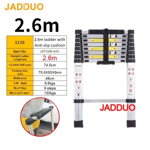 | 2.6m ladder with Anti-slip cushion | JDT1026-ASC | 2.6m | 74.5cm | 75.5X50X9cm | 48cm | 6.6kgs | 9 steps | 150kgs | 966 | 2345 |