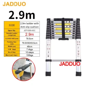 | 2.9m ladder with Anti-slip cushion | JDT1029-ASC | 2.9m | 78.5cm | 79.5X50X9.5cm | 48cm | 7.4kgs | 10 steps | 150kgs | 933 | 2267 |