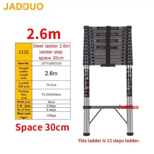 | Steel ladder 2.6m ladder step space 30cm | JDT1026SS30 | 2.6m | 74.5cm | 75.5X50X9cm | 48cm | 6.6kgs | 9 steps | 150kgs | 966 | 2345 |