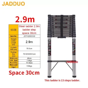 | Steel ladder 2.9m ladder step space 30cm | JDT1029SS30 | 2.9m | 78.5cm | 79.5X50X9.5cm | 48cm | 7.4kgs | 10 steps | 150kgs | 933 | 2267 |