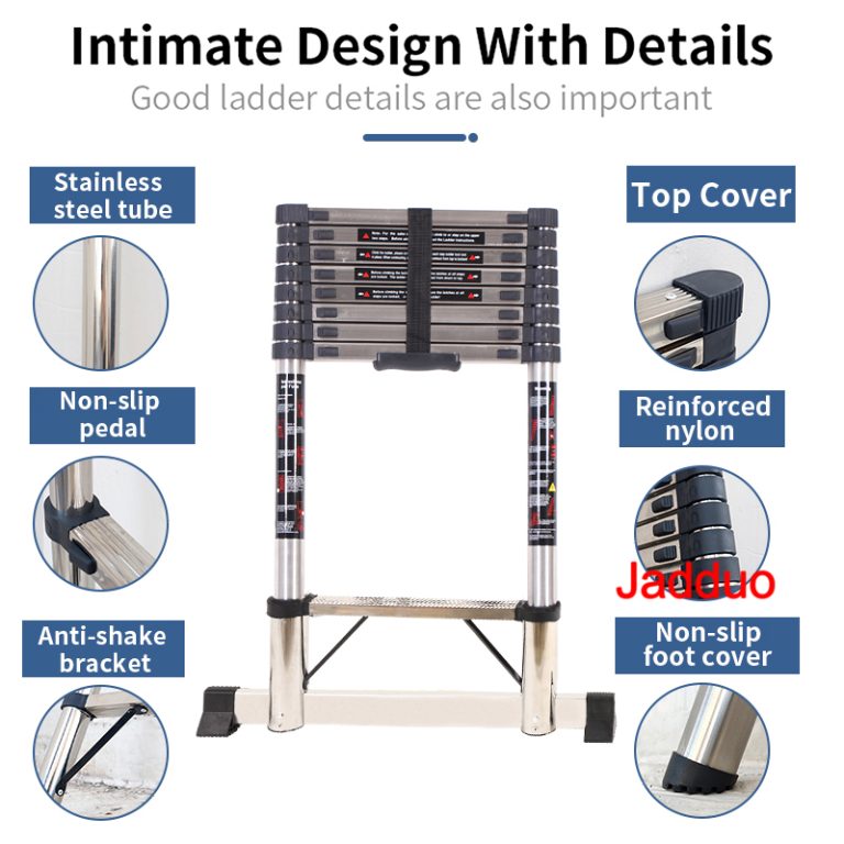 Jadduo‘s 30-step stainless steel telescopic ladder uses premium 201 stainless steel, a high-quality steel with a hardness of 200 degrees. Precise forming keeps the stainless materials thickness at 0.5 to 0.6 mm. That approach leaves the ladder portable yet durable. It holds up to 150 kg. The ladder manages everyday pulling out, folding in, and weight loads.